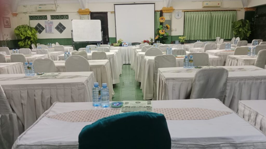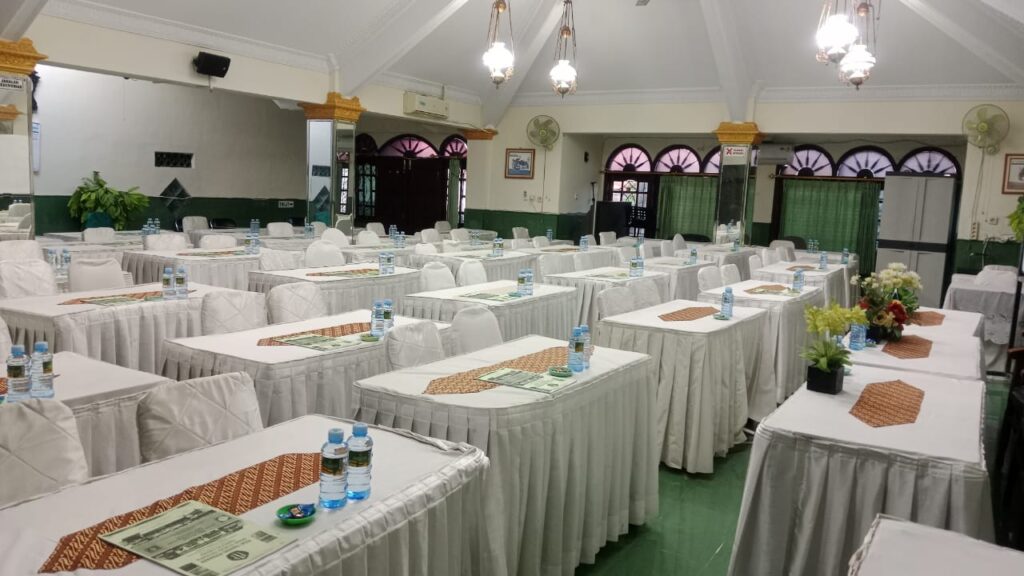 Ruang makan yang sangat luas bagi para peserta yang mengikuti kegiatan training di Pusat Training Perbankan Yogyakarta, sangat nyaman diterangi dengan penerangan yang membuat suasanya jadi tenang.